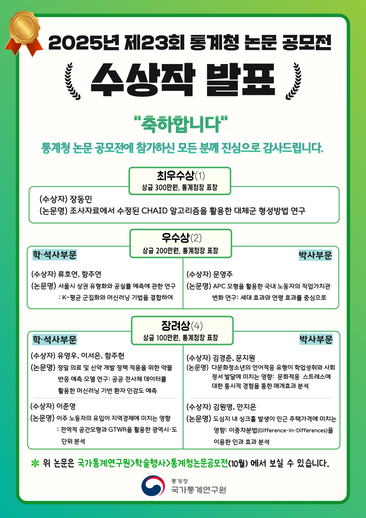 872025년 제23회 통계청 논문공모전 수상작 발표는 12:00 게시됩니다.